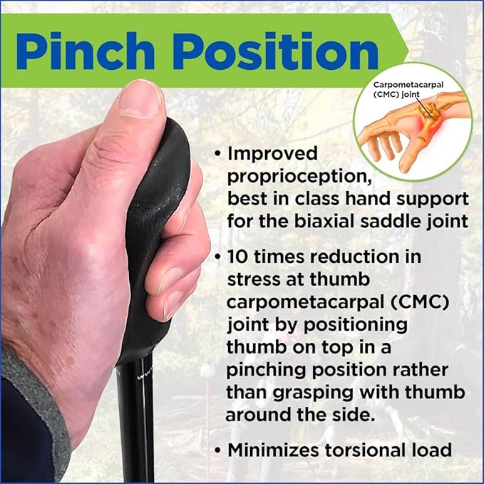 - HIGH QUALITY WALKING POLES: 2 pack of adjustable walking / hiking / rehab poles with a patented contoured grip and dual support zones, designed to provide better balance and stability. Perfect for pole walking for seniors, our patented grips provide a 10 times reduction in stress at thumb carpometacarpal (CMC) joint by positioning thumb on top in a pinching position rather than grasping with thumb around the side.