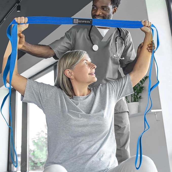 - 【BENEFIT】: Multiple hand-holds along the strap allows for progressive unassisted stretching with greater control. Use this stretch strap to prepare for daily activities, prevent injury, alleviate tightness, increase flexibility and improve range of motion.