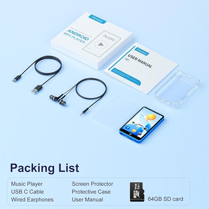 - 【Package Included】1 x MP3 Player, 1 x 64GB SD Card, 1 x USB C Cable, 1 x Wired Earphones, 1 x Screen Protector, 1 x Protective Case, 1 x User Manual; Our MP3 player with bluetooth provide 12 hours of customer service, please contact us if you have any problem during your use. ---Noted: For more detailed User Guide, please contact customer service.