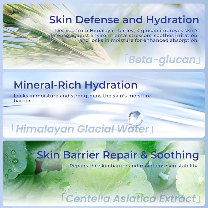 - Skin Defense and Hydration: Derived from Himalayan barley, β-glucan improves skin's defense against environmental stressors, soothes irritation, and locks in moisture for enhanced absorption.