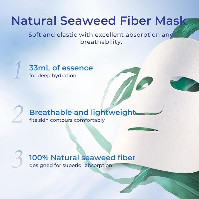 - Seaweed Fiber Mask Fabric: Soft and elastic, the mask fits instantly upon application. Invisible and breathable, it feels light and comfortable. With 33mL of essence, indulge in 15 minutes of moisturizing nourishment.