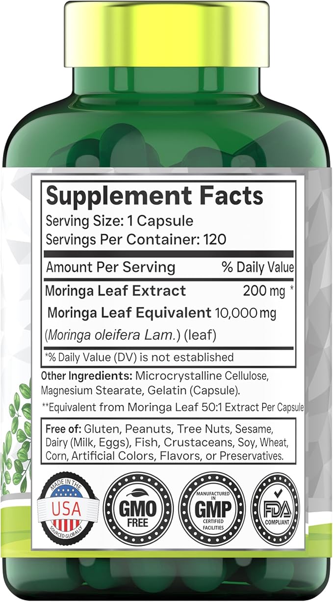 - ✔️ TNVitamins Moringa Capsules are Non-GMO! Our Moringa Powder Capsules are Both Manufactured and Third-Party Laboratory Tested in the USA! They are Free Of: Gluten, Peanuts, Tree Nuts, Sesame, Dairy (Milk and Eggs), Fish, Crustaceans, Soy, Wheat, Corn, Artificial Colors, Flavors, and Preservatives!