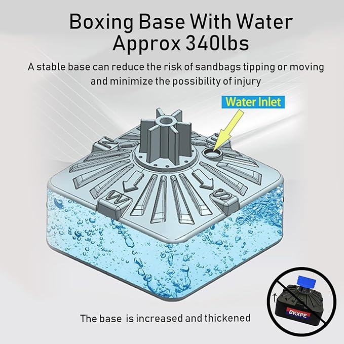 - The boxing bag has a thick base that can be securely fixed by filling it with a large capacity of water or sand. It is recommended to fill the base with 4/5 water or 3/4 sand to enhance stability and prevent it from falling down.