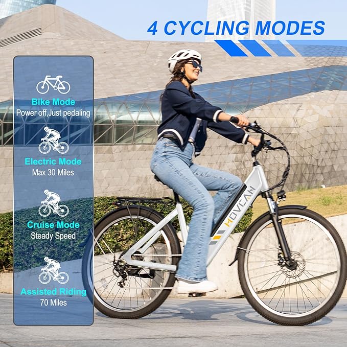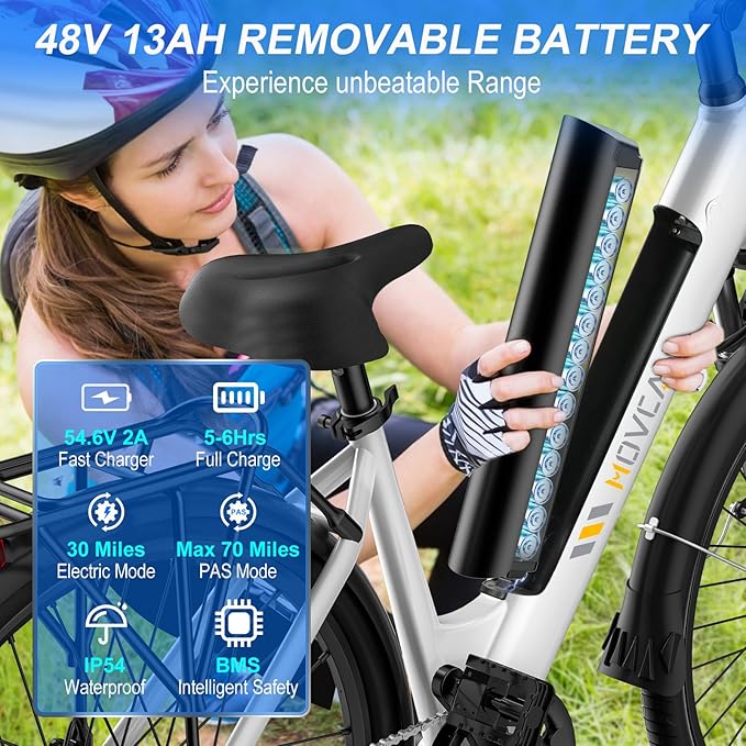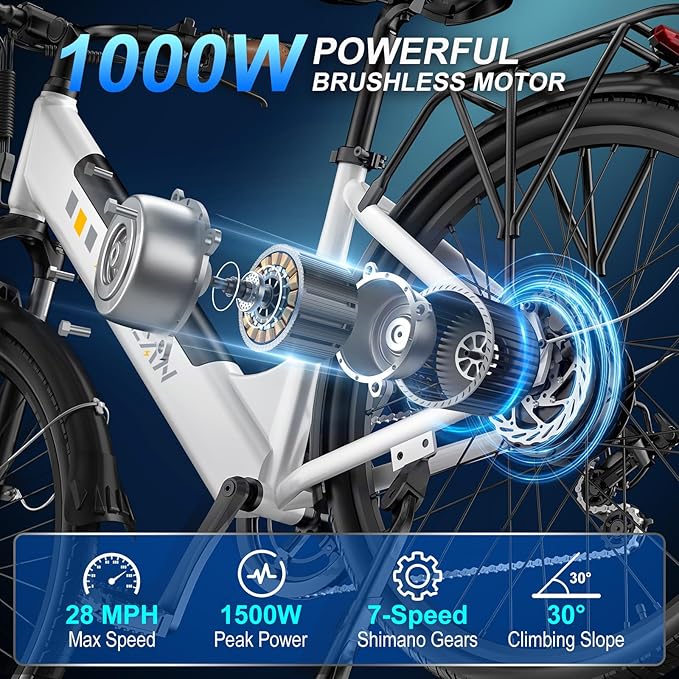 - 【Powerful 1000W Motor】Movcan V80 electric bike Built-in a 1000W(Peak 1500W)brushless hub motor, electric bike for adults can reach a top speed of 28MPH, robust motor delivering 80N.M torque, easily overcome 30° steep hills. You can enjoy a comfortable riding experience and powerful braking even on steep slopes, rugged terrain, or other extreme terrains.