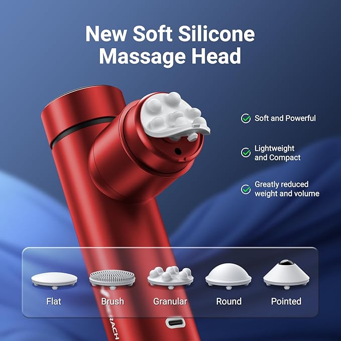 - [Newly Designed Massage Gun] MERACH has redefined the massager gun. MERACH M022 Mini Massage Gun is more mechanical thanks to the high-strength aluminum alloy shell and a transparent cover on the top. This massager abandons the traditional massage head and adopts new 5 silicone mini massage head, which are more convenient to carry, replace and clean. Widely used on the shoulder and neck, back, legs, soles, and other parts.