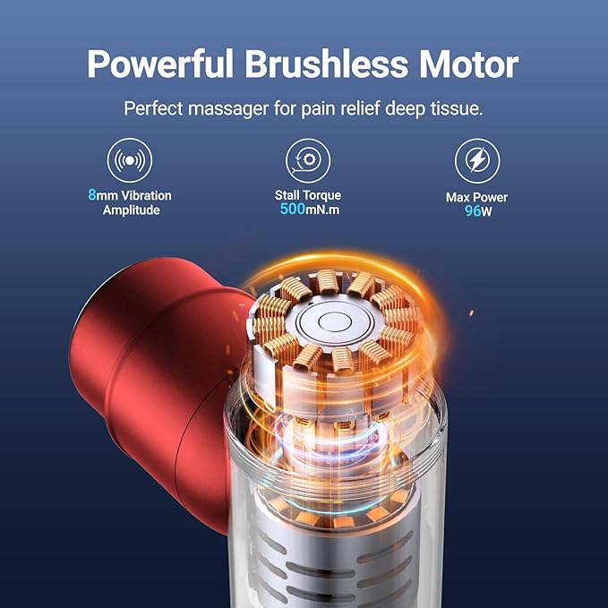 - [Powerful Brushless Motor] With the upgraded structure and powerful brushless motor, the vibration amplitude of this percussion massage gun is up to 8mm. The 3 power modes provide an impact force of 26.5-30.8lbs, meet the needs of muscle relaxation whether pain relief after exercise or daily body massage. In addition, M022 massager is a perfect muscle massager for pain relief deep tissue since the Max 96W power and Stall Torque 500mN.m.