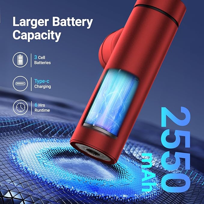 - [Longer Battery Life] Powered by 3*2550mAh batteries, the mini massage gun offers an extended runtime of up to 6 hours while providing strong power. Support fast Type-C charging, compatible with 5V/2A adapters.The fascia gun will automatically enter standby mode after working continuously for 10 minutes.