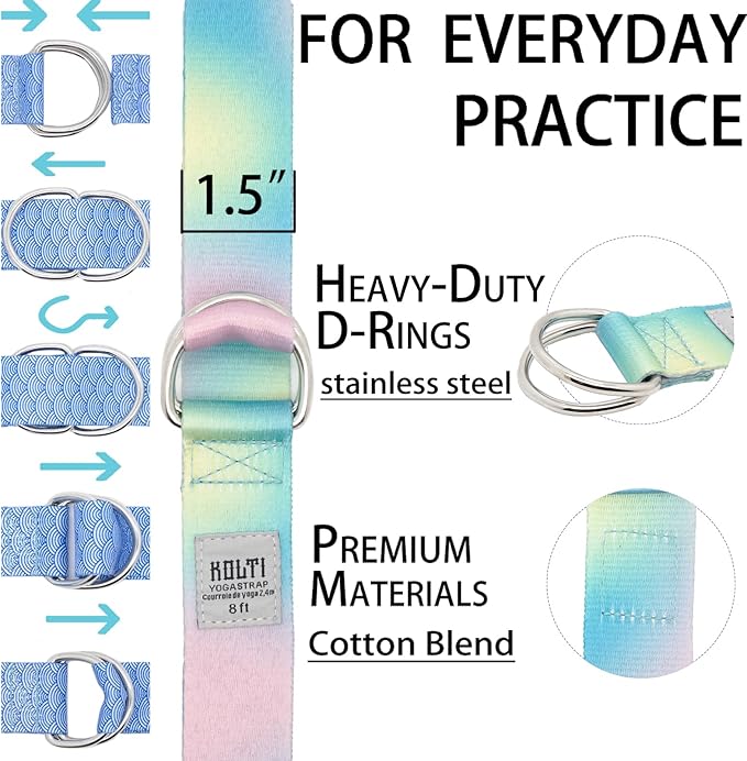 - D-SHAPED BUCKLE DESIGN: The Kolti yoga band features an innovative, easy to release, and adjustable D-shaped dual ring metal buckle with a thickness of 0.3 silver and a width of 2.1 inches, which is sturdy enough to withstand intense stretching and repeated yoga classes. In addition, D-shaped buckles are less likely to slide than rectangular buckles, ensuring your safety during use. Compared to rectangular buckles, the D-shaped design is more stable, effectively reducing the possibility of sliding and ensuring your safe practice, making every stretch more worry free.