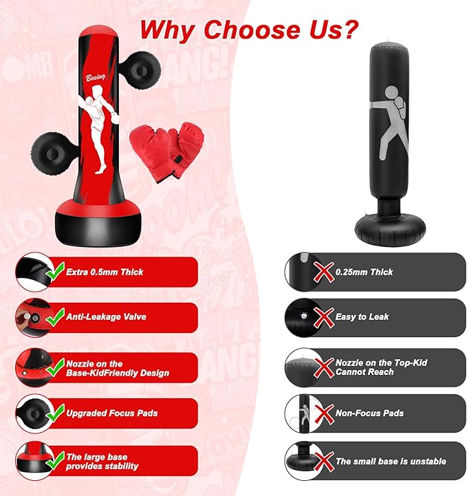 - Enhanced Anti-Leak Design: Vobab boxing bag are factory-inspected for top quality, ensuring no air leaks for uninterrupted workouts.The Punching Bag is 69'' tall, perfect for kids and teens. High quality PVC material make the standing punching bag more durable. Your satisfaction and fitness goals are our priority, ensuring mutual success