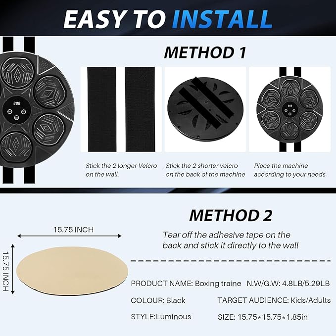 - Easy to Install : Our music boxing machine is easy to setup and use and doesn't take up a lot of space. It's wall-mounted without drilling holes in the wall, use double sided tape or velcro to attach the boxing machine to the wall adjust to preferred height. The machine has a compact design that fits perfectly in home.