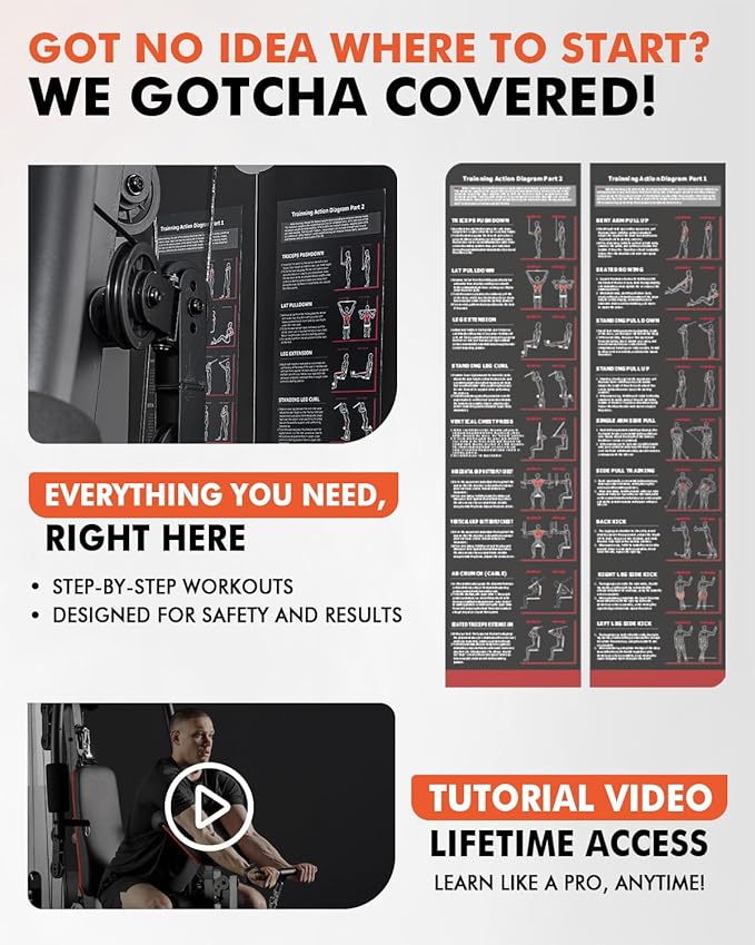 - [More than 3 options] Not only high/mid/low pulley system but also chest press/chest fly/back extension in the same machine. Works with multiple handles to target more precise muscle groups. Adapts to a wider range of heights. A movement guide has been added to provide you with inspiration for new strength training schedule.