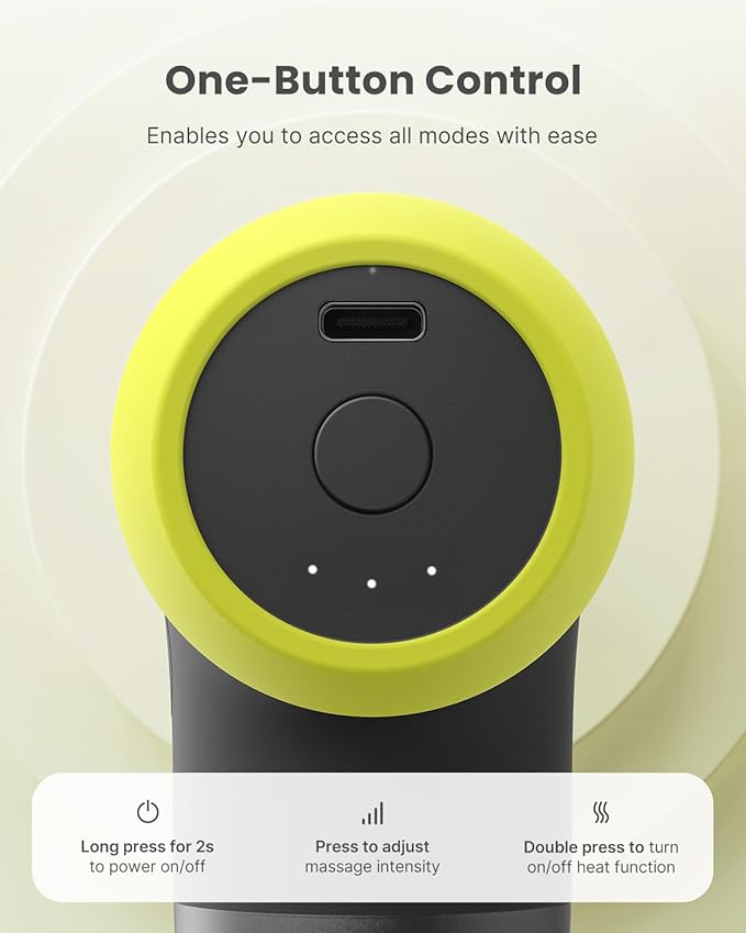 - Effective Heated Massage: Equipped with heat-conductive steel head, the deep tissue massage gun warms up to 46℃/114°F in just 1 minute, effectively reducing muscle tension.Note:Double press the Power button to enable the heating function. The light is red when the heating function is activated. Do not use the silicone massage head when using the heating function.