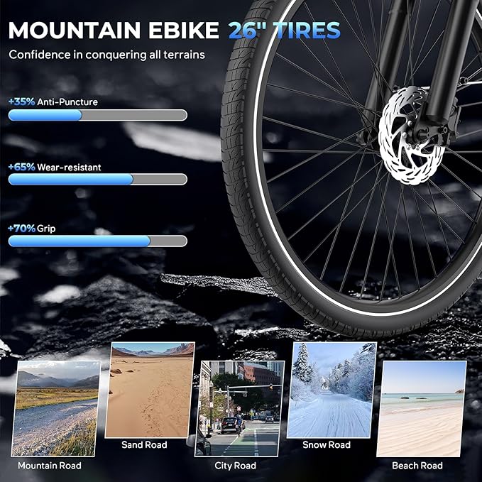 - 【26" All Terrain Tire】Puncture-resistant tire adopt 26"*1.95", providing better traction and a smoother ride, and the tread design reduces rolling friction and side slip, combined with front and rear brake, ensure excellent stability and comfort across all terrains, such as snow road, sand road, gravel road, and the height of 26inch tire is suitable for most adult men and women.