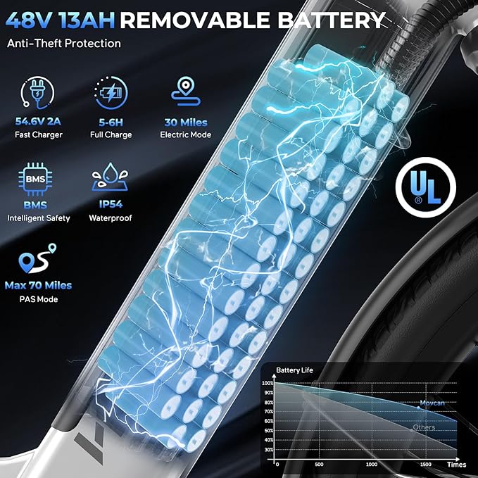 - 【48V 13Ah Removable Battery & Limitless Exploration】Ebikes is equipped with 48V 13Ah batteries, which are UL2849 certified and have a BMS system, greatly improve the safety factor. The removable design makes it more convenient to charge the battery at home or office. Providing up to 70 miles range per charge (PAS mode) and 30 miles in pure electric mode. Allowing you to go anywhere you want.