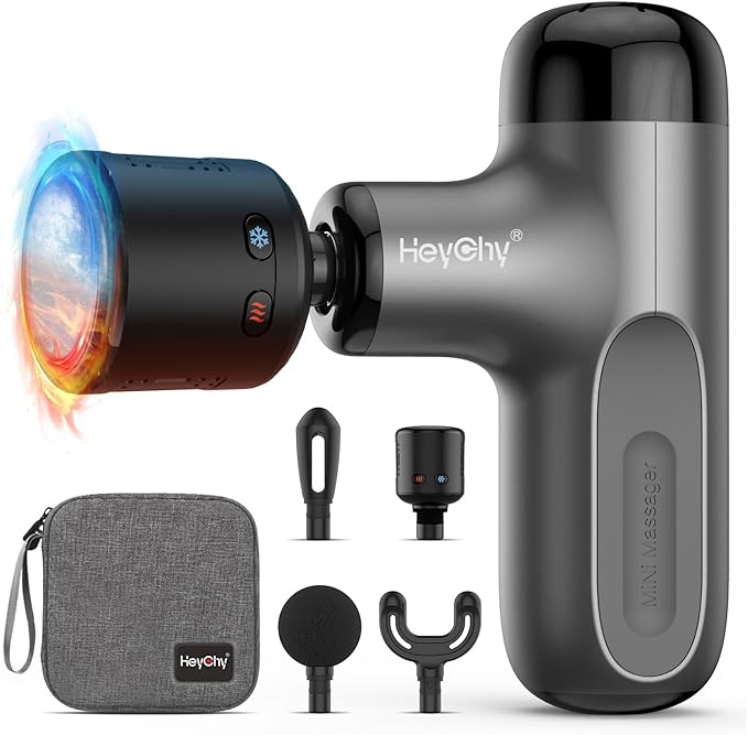 - 【Hot and Cold Therapy】HeyChy massager gun provides 1 heating and cooling massage head that can heat up to 113°F (45°C) or cool down to 50°F(10°C) for deeper muscle relaxation. You could freely choose 5 speeds and 4 attachments depending on the levels of your muscle soreness or pain by pressing the power button.