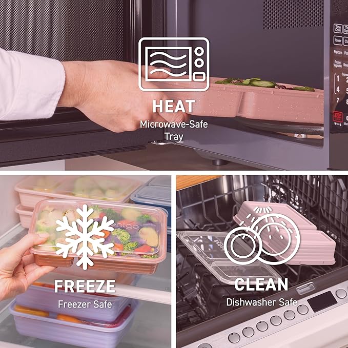 - Easy to Heat & Clean: Safely heat up your food straight from the freezer or refrigerator for warm, delicious meals and leftovers. Each meal prep container is both microwave and top-shelf dishwasher safe. Note: do not microwave lids, only the trays are microwavable. For best results, hand wash to extend the life of the product.