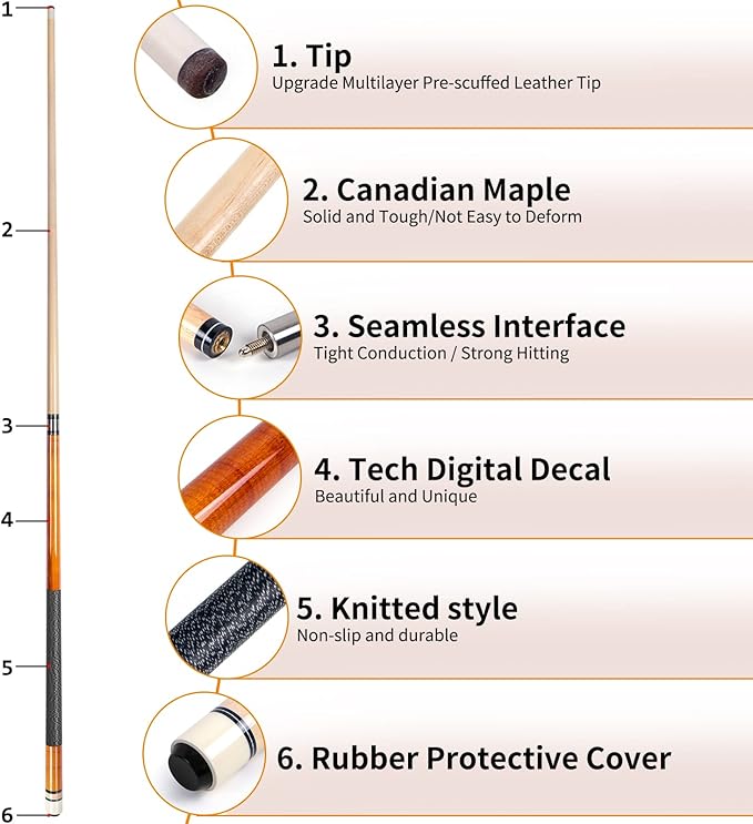 • Canadian Maple Wood:Firm and durable, we have chosen the best quality for the pool stick and the pool cue tips durability. Each pool cue case contains 4 unique pool cues sticks