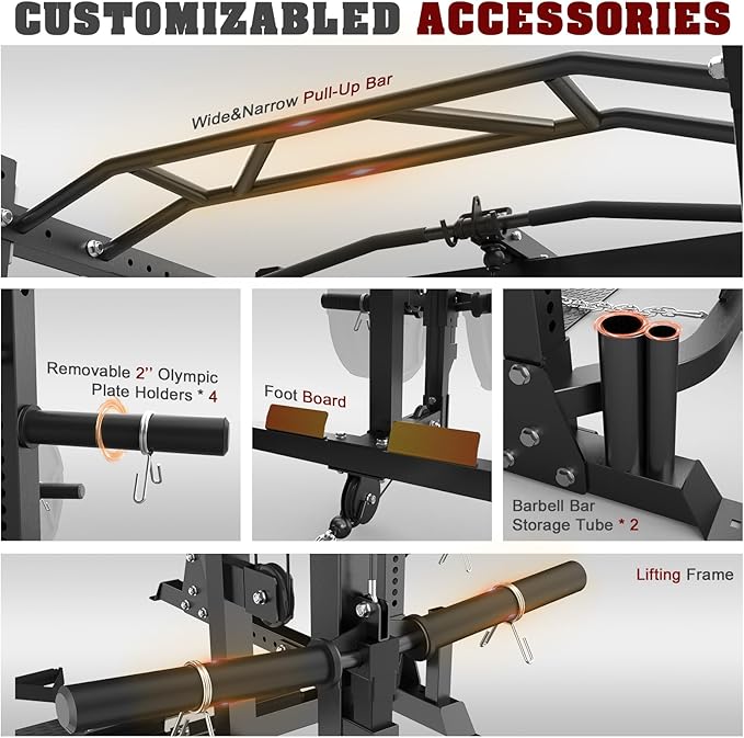 - 【CUSTOMIZABLED FREE ACCESSORIES】- Safety arms, foot pedal, J-hooks, T-bar, LAT bars, cable bar, and foot strap are included in the package to make it easy for exercisers to train in various muscle areas. In addition, we have designed 4 barbell bar holders and 4 weight storage racks fits the 2" Olympic or 1" standard weight plates and barbells.