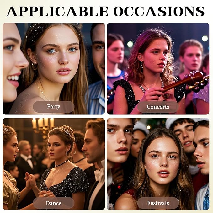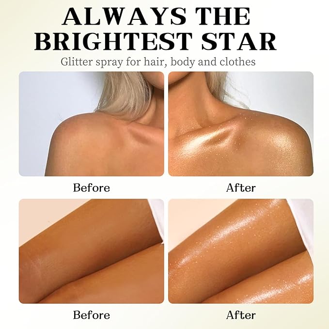 - Multi-Purpose Glitter Spray: Our body glitter spray is made of glitter particles, delivering a charming shimmer effect. You can spray it on your body, hair, face, skin, and even clothes. It will make you the center of attention under the lights at parties or nightclubs