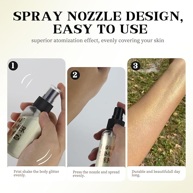- Safe And Easy To Clean: This glitter body spray is made of pure natural ingredients, suitable for all skin types. In addition, it has a lightweight texture that won't make your skin feel heavy, maintaining the natural translucent effect of the skin. It can be easily washed off with shampoo and water