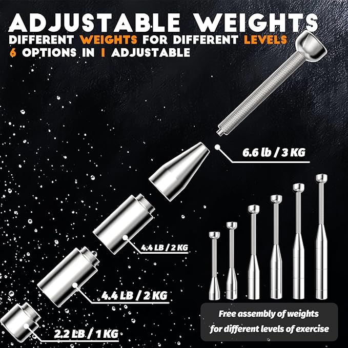 - 【Adjustable weight】By adjusting the steel weight configuration, you can increase the resistance by 6.6 level of resistance or more to suit your fitness level.6.6/11/15.4/17.6LBs weight adjustable Macebell barbells are available to suit your individual ability level.