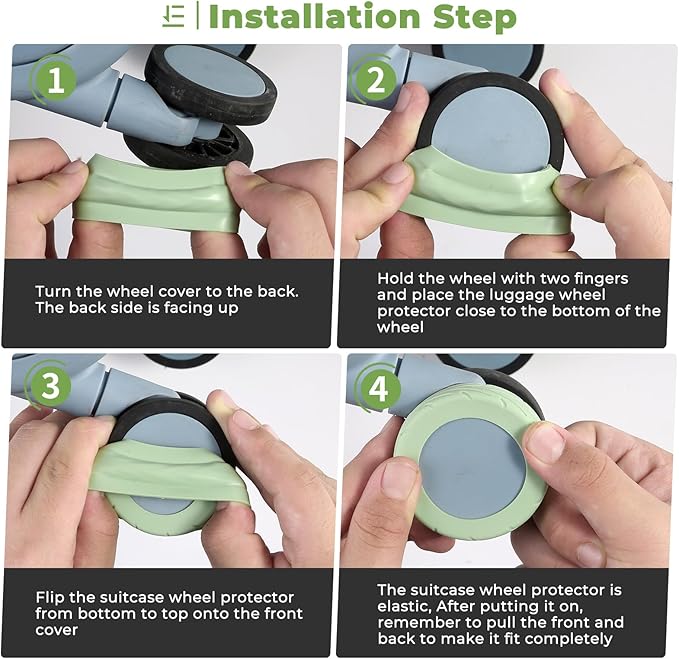 - [Fits Most Suitcases] These suitcase covers for luggage wheel are suitable for suitcases with wheel diameter between 2.0-2.4"(50-60mm),the distance between the luggage wheel and wheel base fender should be more than 0.07"(1.8mm),and the distance between the luggage wheel and axle should be more than 0.05"(1.2mm) ,This Suitcase wheel cover for luggage Suitable for 4x2 double wheels, not suitable for 4x1 single wheels luggage