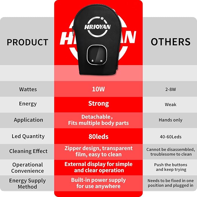 - PROFESSIONAL LED LIGHT THERAPY: The Hrioyan red light therapy glove contain 80 LED beads, each consisting of 660 nm red light and 850 nm near infrared light. 660 nm red light (visible light) can penetrate the skin epidermis, promote cell metabolism and repair damaged skin; 850 nm infrared light (invisible light) penetrates deeper than the red light, and can have a thermal effect on muscles and accelerate blood circulation. produce thermal effect, accelerate blood circulation, relieve pain and relax muscle tension