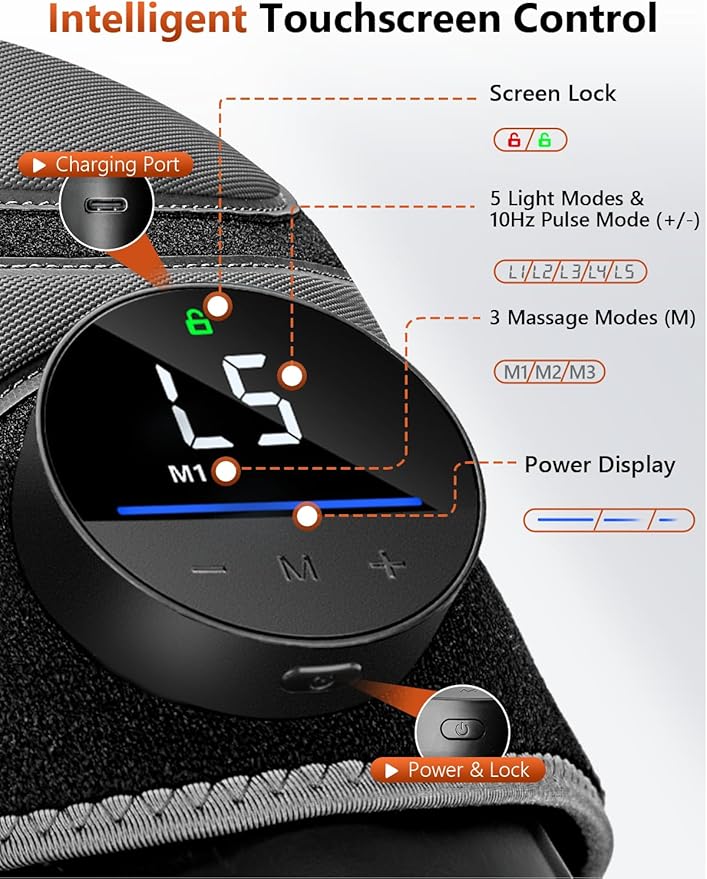 - 🌟【Intelligent Touchscreen Control】 Effortlessly customize your therapy with Intelligent Touchscreen Control. Adjust 3 vibration levels, 5 red light modes, and a 10Hz pulse mode.
