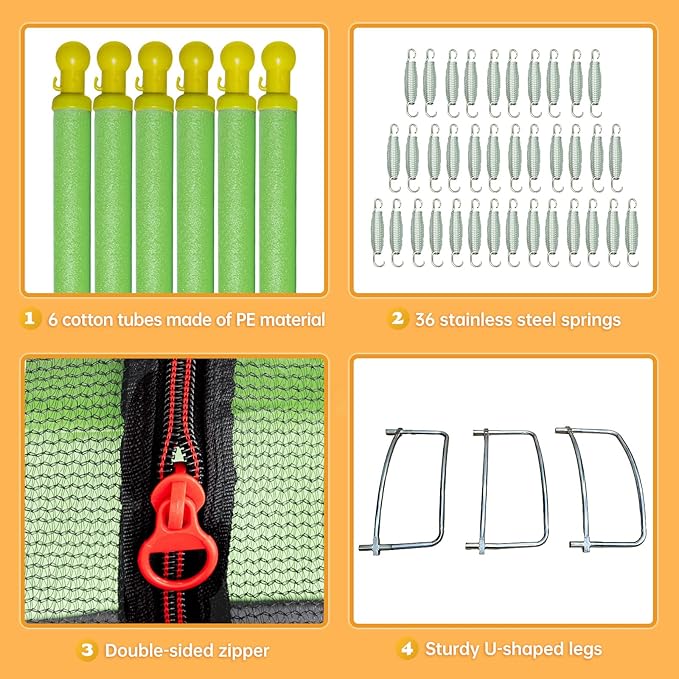 - 👉【INSTALLATION PRECAUTIONS】-1. After the zipper part of the mesh is wrinkled when installing the mesh, the rope at the bottom of the mesh can be tied to the triangle buckle connected by the spring and the jump cloth, so that the mesh will be tightened and the zipper will become flat. 2. When installing six guardrails, you can assemble five guardrails first, and then install the last guardrail after inserting the mesh.