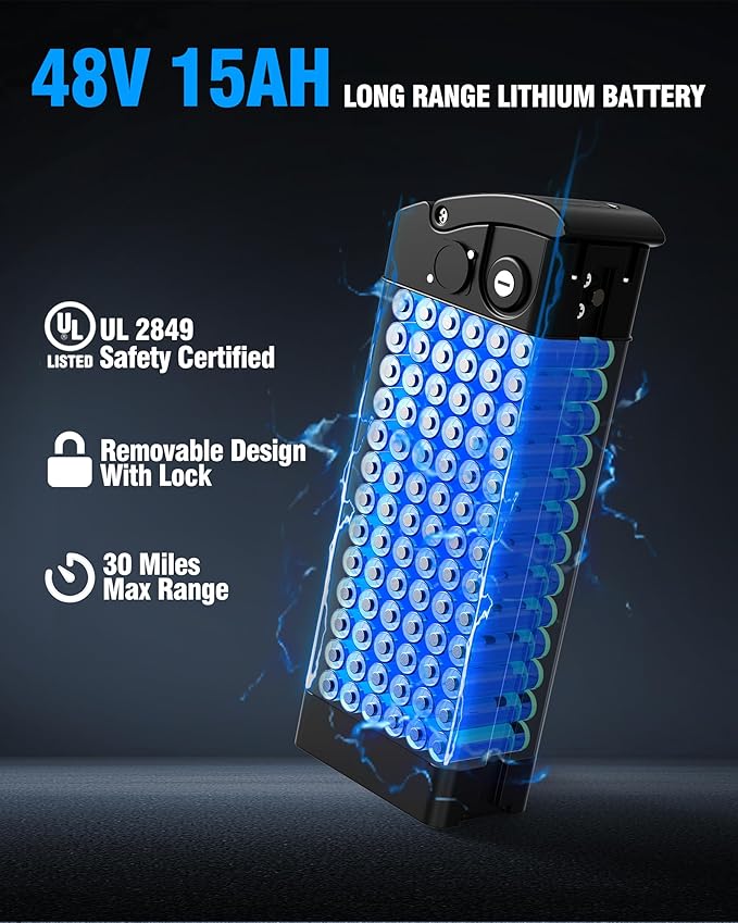 - HIGH CAPACITY BATTERY- 48V 15AH ebike battery with 2A fast charger can be quickly recharged in 3 hours, providing you with up to 30-45km of power for your ride (pedal assist mode)