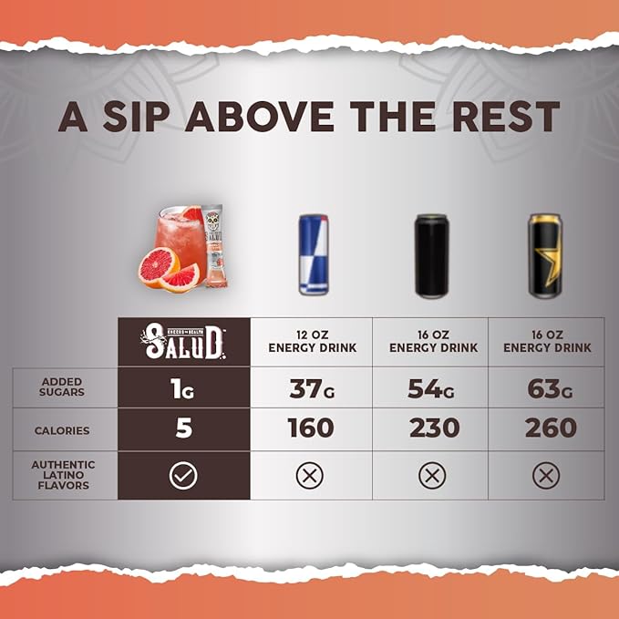 - US vs THEM - Unlike traditional energy drinks loaded with sugars, Salud will turn plain water into a mouth-watering Agua Fresca drink with only 1g of added sugar and 5 calories per serving. You can feel good about starting your mornings and workouts with Salud!