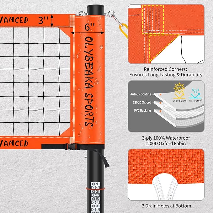 - ๐๐จ๐๐ฎ๐ฌ๐ญ & ๐๐๐๐ญ๐ก๐๐ซ-๐๐๐ฌ๐ข๐ฌ๐ญ๐๐ง๐ญ ๐๐๐ญ: features 6" side and 3" top/bottom bindings in 13.2 OZ 1200D Oxford fabric (0.45mm PVC-backed). Boasting excellent anti-UV and anti-aging properties, itโs water-repellent and can withstand over 283 lbs of tensile strength. 3 bottom drain holes prevent water buildup, while reinforced corners avoid tears.The 45-strand HDPE knotted net offers top-notch impact and UV protection, ideal for outdoor, beach, grass, and backyard play.