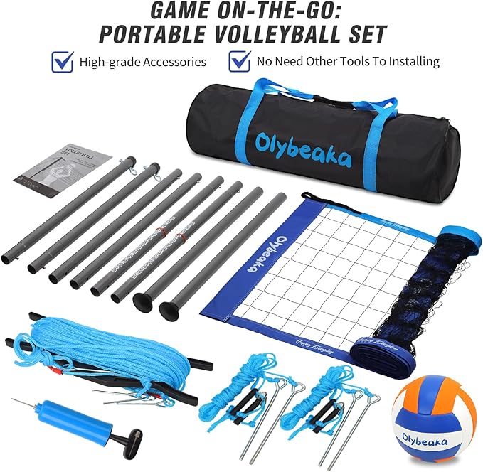 Portable Outdoor Volleyball Net Set System for Backyard Beach with Heavy Duty Poles, Durable Net, PU Volleyball & Pump, Carry Bag