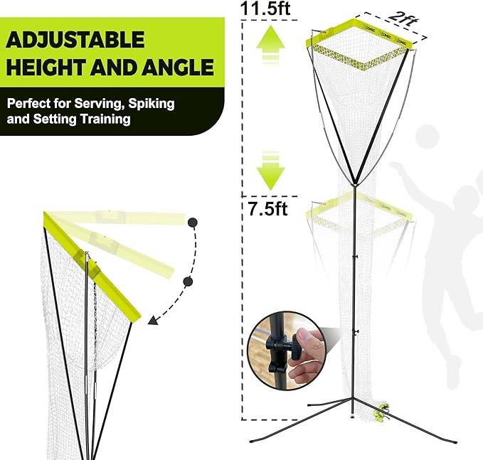- Adjustable Height and Angle: Take control of your training with heights ranging from 7.5 to 11.5 feet. Easily adjust this basket between 45 and 180 degrees, catering to your practice needs. This volleyball setter trainer net is perfect for serving, spiking, and setting training, accommodating all ages and skill levels