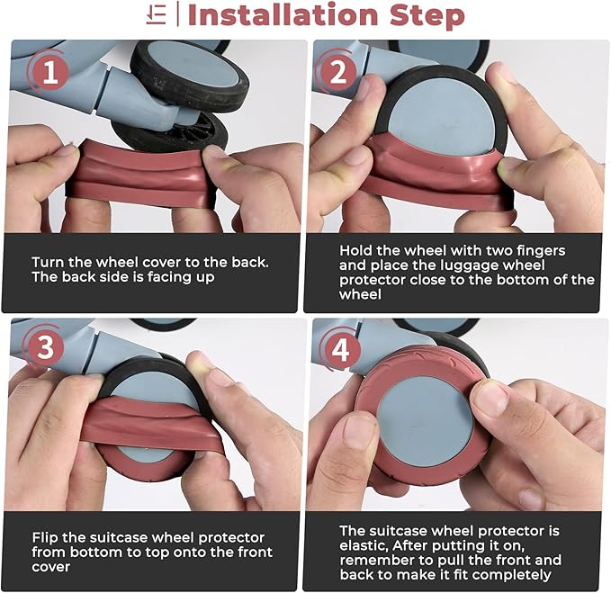 - [Fits Most Suitcases] These suitcase covers for luggage wheel are suitable for suitcases with wheel diameter between 2.0-2.4"(50-60mm),the distance between the luggage wheel and wheel base fender should be more than 0.07"(1.8mm),and the distance between the luggage wheel and axle should be more than 0.05"(1.2mm) ,This Suitcase wheel cover for luggage Suitable for 4x2 double wheels, not suitable for 4x1 single wheels luggage