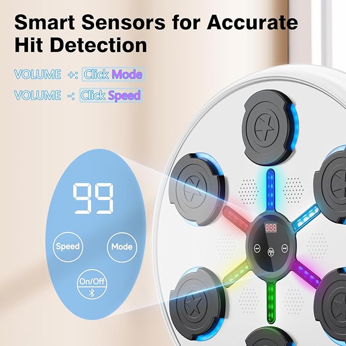 - Sync with Music and LED Light Effects: The music boxing machine provides an immersive workout experience with colorful LED lights that sync to the beat of your music. The lights guide your punches, improving your reaction time and coordination. Whether you're working out or having fun with the family, this boxing machine makes every session interactive and exciting