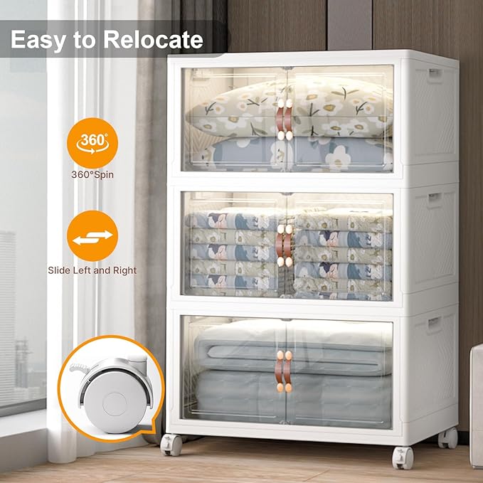 Extra Large Stackable Storage Bins with Lids & Wheels & Door, 480QT-160QT/40GAL*3Pack Foldable Collapsible Closet Organizers, Plastic containers drawers for bedroom Dorm