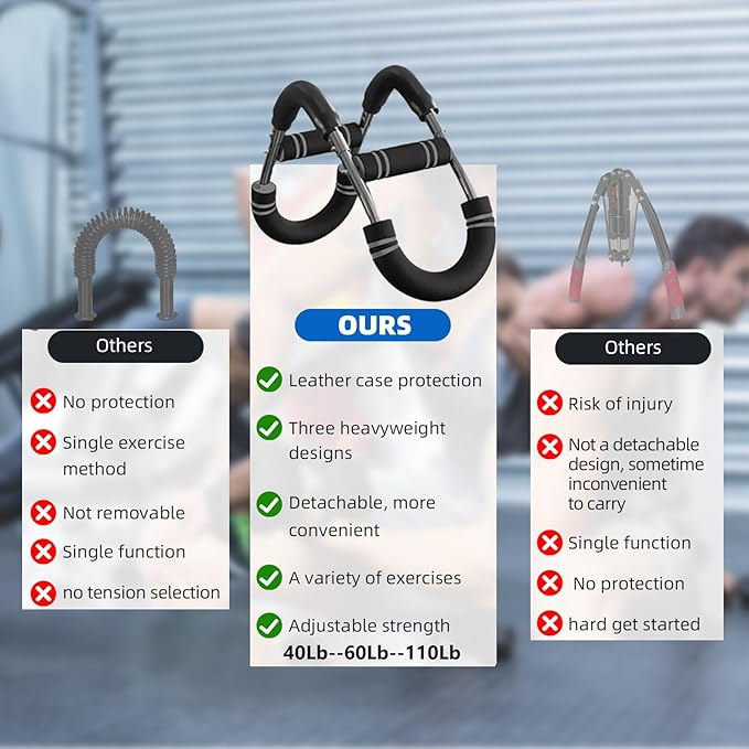 - 3 Upgraded Protections: Chest workout equipment is easy to exercise with curved grips, thickened foam handle is comfortable to grip, non-slip and does not hurt your hands. Wear-resistant holster wraps the spring to avoid sports injuries, not clip hair and muscles