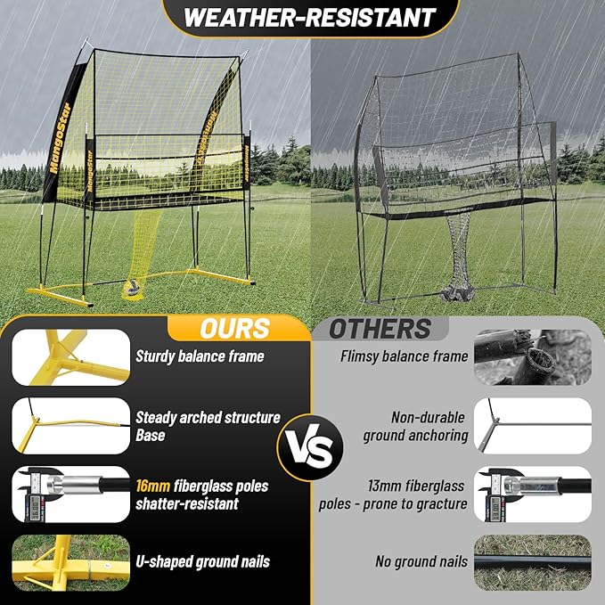 - Optimized Sturdy Construction: Designed with heavy-duty, powder-coated materials, this volleyball training equipment is solid and weather-resistant, even in windstorms. The upgraded 16MM fiberglass poles last over 250,000 uses, absorbing impact to prevent warping or breaking. Four metal stakes add extra stability for outdoor use.