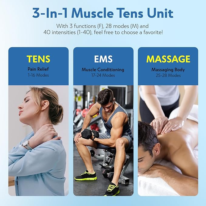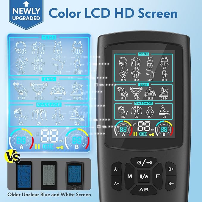 - Premium TENS & EMS Muscle Stimulator with 28 Modes and Dual Channel Technology. Comes with 8PCS Electrode Pads for targeted relief. Perfect for muscles, shoulder, neck and back pain relief. Features New Upgraded Color Screen for easy operation. Doctor-recommended for natural pain management and muscle recovery.