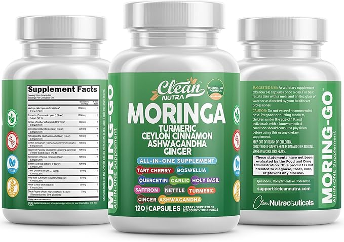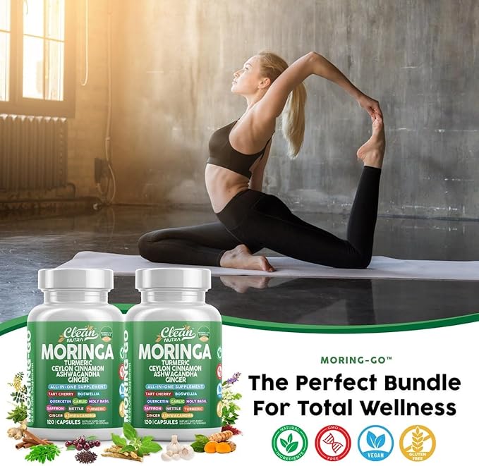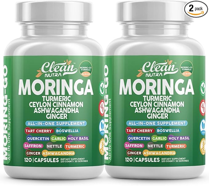 Moringa Powder Capsules + Turmeric Moringa Leaf Ceylon Cinnamon Ashwagandha Ginger Tart Cherry Boswellia Quercetin Garlic Holy Basil Saffron Nettle Black Pepper Moring-Go Supplement By Clean Nutra (2)
