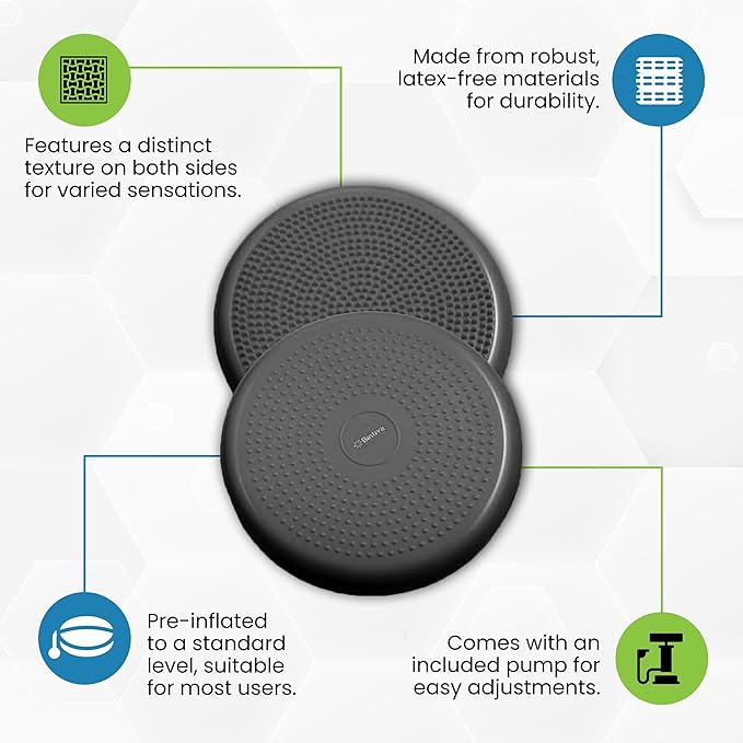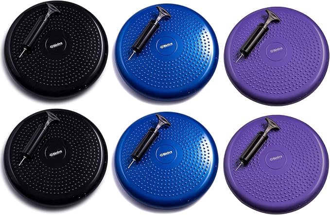 - Ships inflated, includes a pump for adjustments. Stability disc size: 13 inches / 33 cm diameter