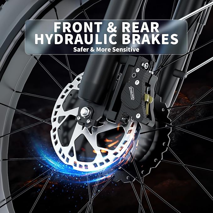 - Dual Suspension & Hydraulic Disc Brakes: This adult electric bike features an advanced front and rear dual suspension system, absorbing impacts from rough roads and uneven trails while reducing joint stress for a smooth, comfortable ride. The hydraulic disc brakes provide powerful, precise stopping power with minimal effort, ensuring reliable control on any terrain for a worry-free experience.
