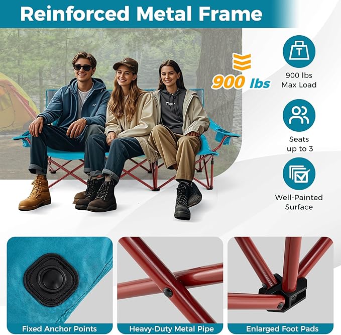 - Oversized Padded Seat: With 62" x 19" seat dimension, this camping chair seats up to 3. The chair also features a comfortable padded seat consisting of premium 600*300D Oxford cloth and soft sponge, ensuring a cozy yet long-lasting seating experience.