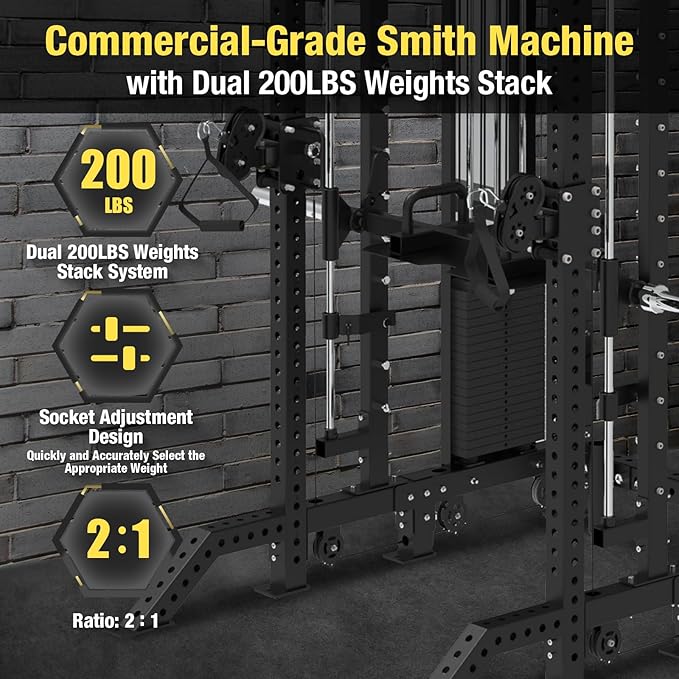 - Smooth & Precise Pulley System: The Smith Machine features a high-quality pulley system with dual 200lb weight stacks and a 2:1 pulley ratio, reducing strain while maximizing resistance. With adjustable positions, the cable system offers smooth motion and extended travel, ensuring a seamless experience for exercises like bicep curls, triceps pushdowns, chest presses, and more