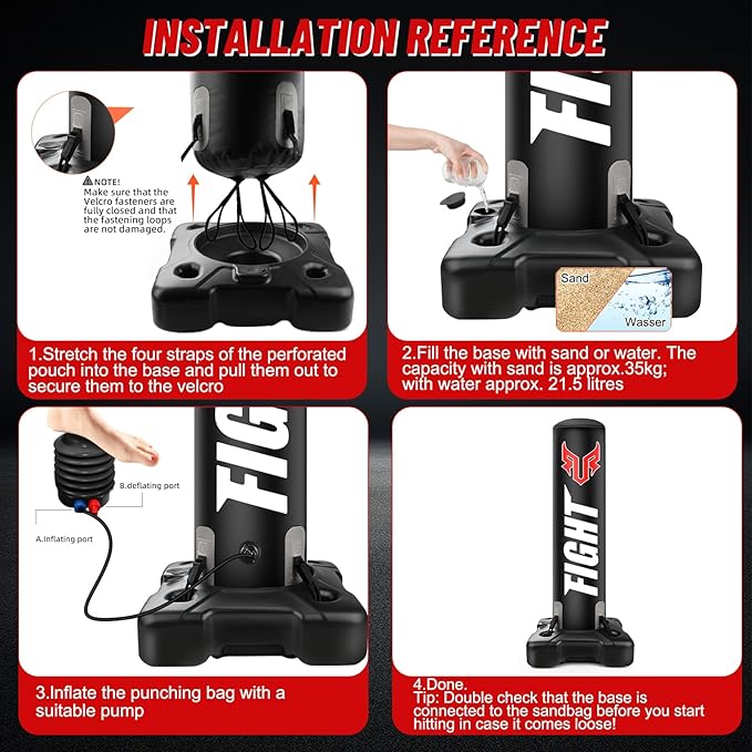 - Easy to Use: Simply fill the base of the boxing heavy bag with water or sand or both, then inflate the body parts with the air pump, then you can get a sturdy stand up punching bag.