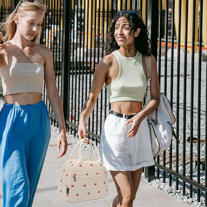 - ✿ Large Size:the dimension of the container is:9.1”L×6.1”W×12.3”H,but not too bulky , it could give roomy storage space you need to hold your favotite meals,delies and lunch treats.You could fill the roomy compartments or pockets with lunch boxes, food containers, condiments,fruit salad bowls,utensils,napkins,can opener,wallet,keys and other essentials.