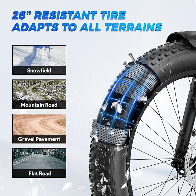 - 👍【Full Suspension, 26” Fat Tires & 180mm Disc Brakes】 The Aipas electric mountain bike features a dual suspension system with a lockable front fork and rear shock absorber, delivering a smooth, comfortable ride across rugged terrain. The 26" x 4.0" fat tires enhance grip and stability on sand, snow, gravel, and city streets. Paired with 180mm mechanical disc brakes, this ebike offers strong, responsive stopping power for added control and safety in all riding conditions.