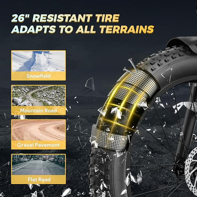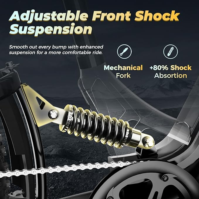 • 👍【Full Suspension, 26” Fat Tires & 180mm Disc Brakes】 The Aipas electric mountain bike features a dual suspension system with a lockable front fork and rear shock absorber, delivering a smooth, comfortable ride across rugged terrain. The 26" x 4.0" fat tires enhance grip and stability on sand, snow, gravel, and city streets. Paired with 180mm mechanical disc brakes, this ebike offers strong, responsive stopping power for added control and safety in all riding conditions.