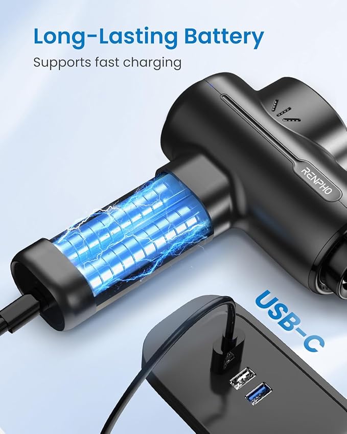 - 1.5H Fast Charging: The muscle massage gun supports 18W PD fast charging and A-C & C-C charging. It only takes 1.5 hours to charge fully. A 10-minute auto-off function is preset for safety. You can turn it on again based on your needs